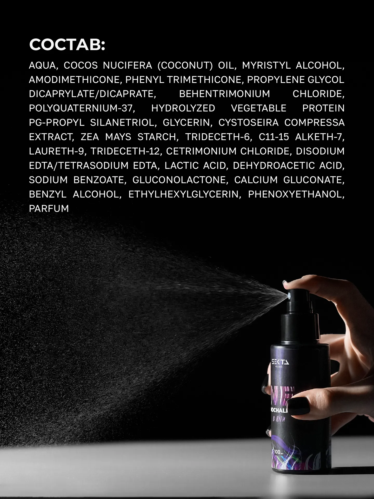 Режим смываемого ухода: после использования шампуня и кондиционера/маски, избавьтесь от лишней влаги на волосах (рекомендуем выжать влагу полотенцем) и используйте спрей. Продукт необходимо аккуратно равномерно распределить по всем волосам с помощью расчёсывания или механическим путём (руками). Время выдержки: 3-5 минут, после чего смыть тёплой (не горячей) водой. Далее можно переходить к сушке и укладке волос.