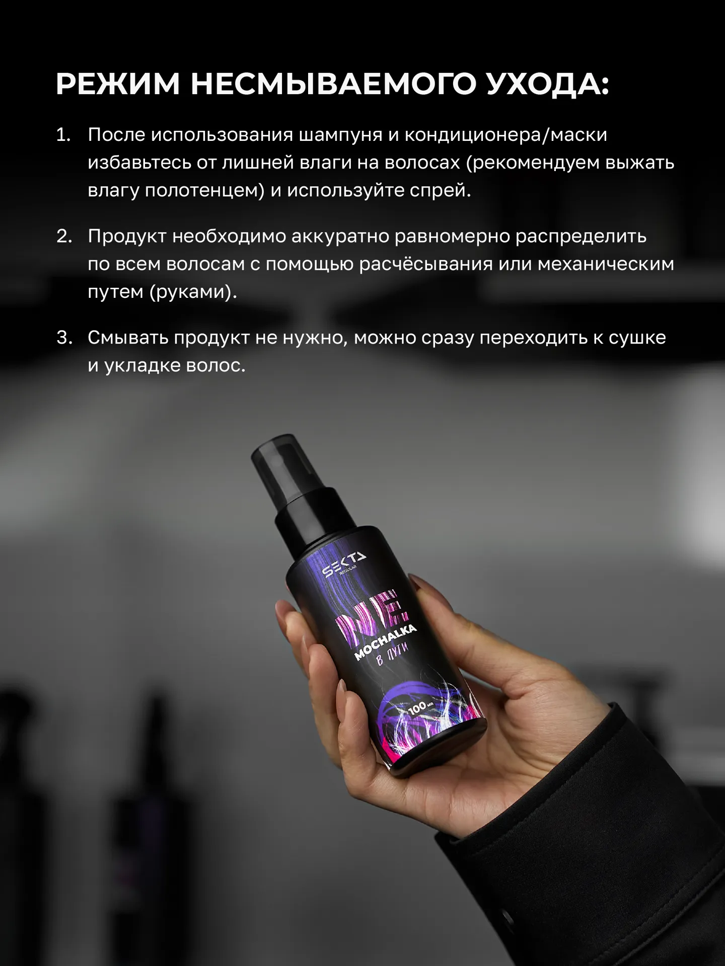 Режим несмываемого ухода: после использования шампуня и кондиционера/маски, избавьтесь от лишней влаги на волосах (рекомендуем выжать влагу полотенцем) и используйте спрей. Продукт необходимо аккуратно равномерно распределить по всем волосам с помощью расчёсывания или механическим путём (руками). Далее смывать продукт с волос не нужно, можно сразу переходить к сушке и укладке волос.