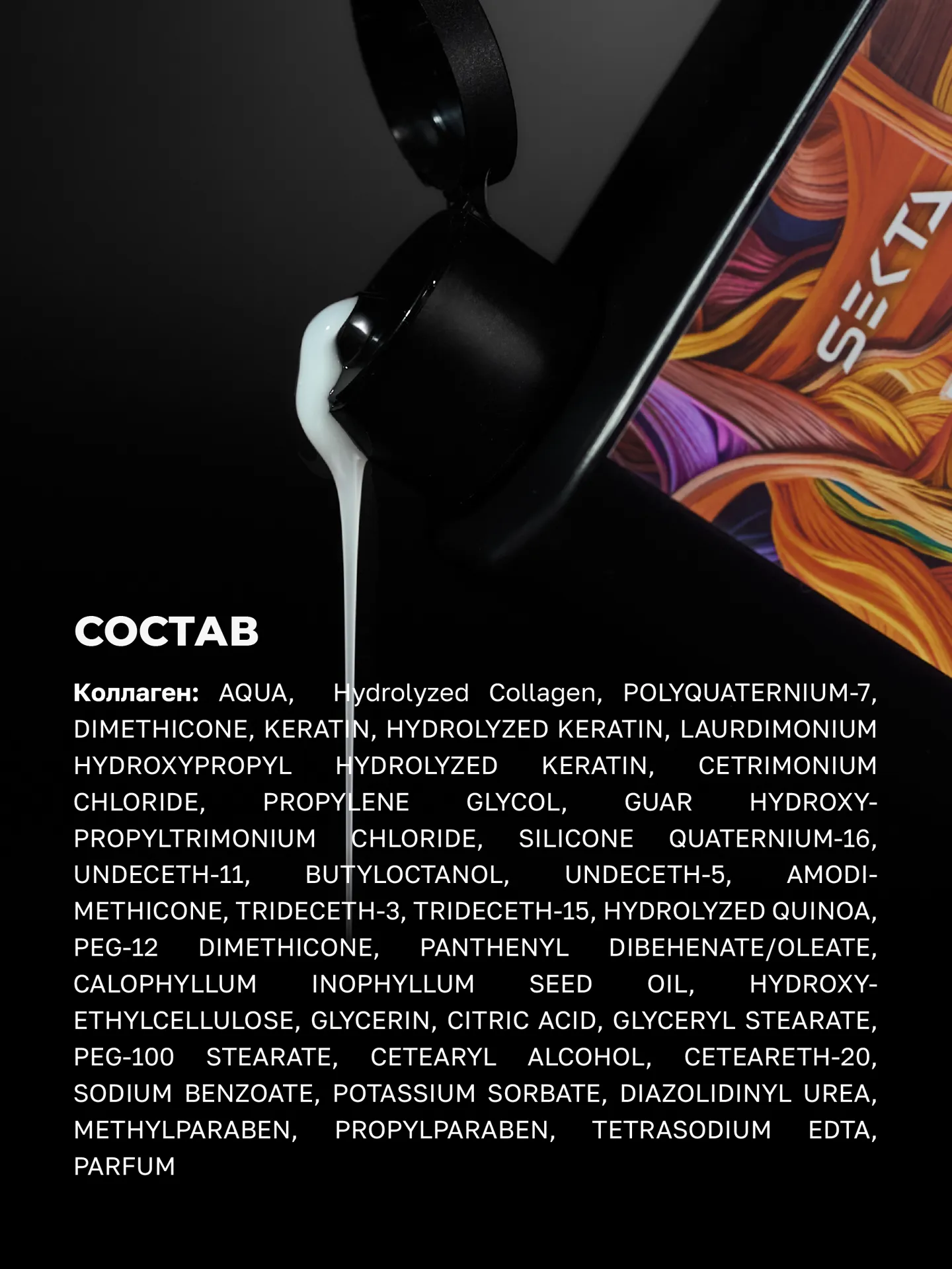 СОСТАВ/INCI: AQUA, KERATIN, HYDROLYZED KERATIN, LAURDIMONIUM HYDROXYPROPYL HYDROLYZED KERATIN, CETRIMONIUM CHLORIDE, PROPYLENE GLYCOL, GUAR HYDROXYPROPYLTRIMONIUM CHLORIDE, POLYQUATERNIUM-7, SILICONE QUATERNIUM-16, UNDECETH-11, BUTYLOCTANOL, UNDECETH-5, AMODIMETHICONE, TRIDECETH-3, TRIDECETH-15, HYDROLYZED COLLAGEN, HYDROLYZED QUINOA, PEG-12 DIMETHICONE, PANTHENYL DIBEHENATE/OLEATE, CALOPHYLLUM INOPHYLLUM SEED OIL, HYDROXYETHYLCELLULOSE, GLYCERIN, CITRIC ACID, DIMETHICONE, GLYCERYL STEARATE, PEG-100 STEARATE, CETEARYL ALCOHOL, CETEARETH-20, SODIUM BENZOATE, POTASSIUM SORBATE, DIAZOLIDINYL UREA, METHYLPARABEN, PROPYLPARABEN, TETRASODIUM EDTA, PARFUM