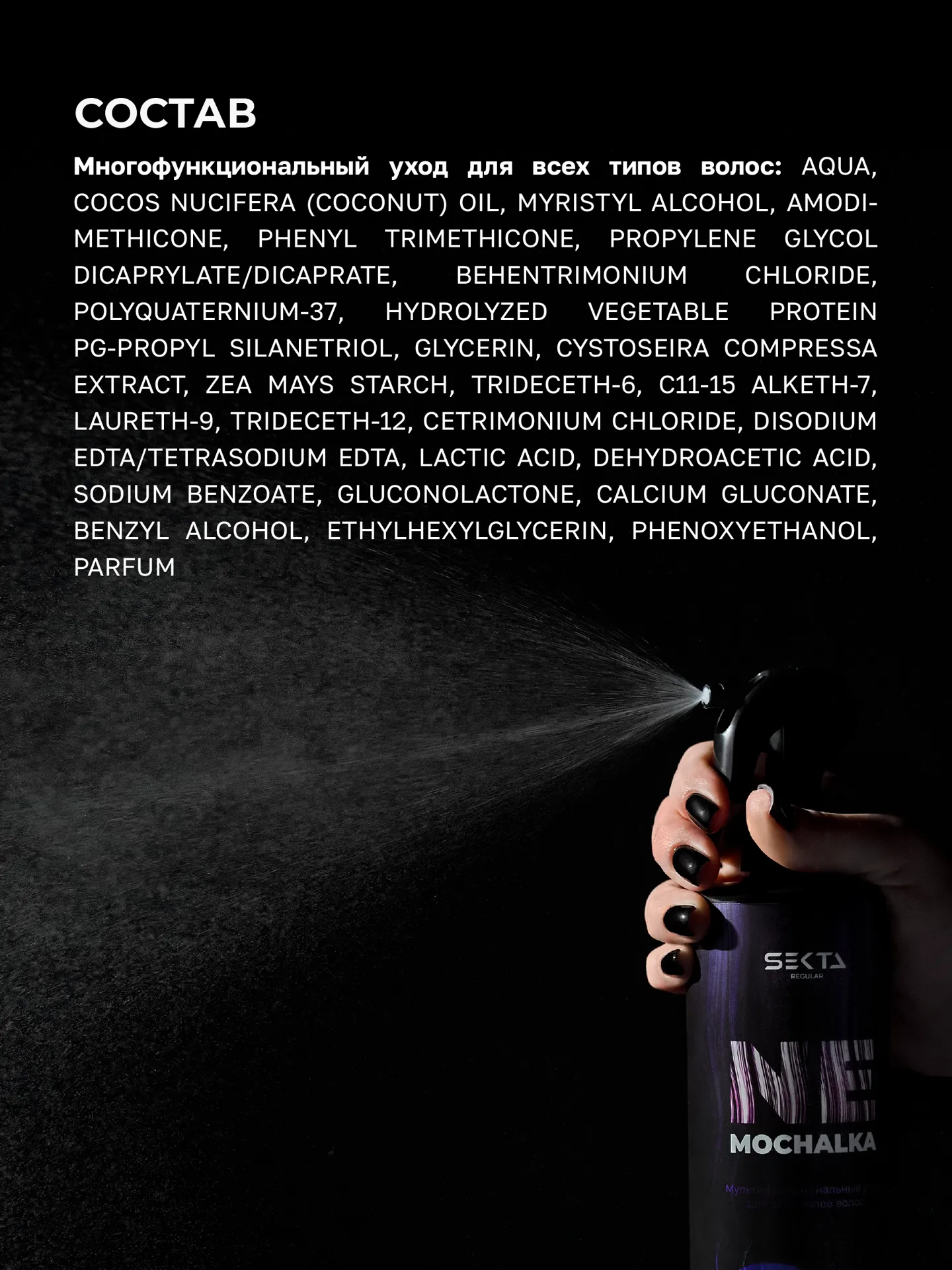 СОСТАВ / INCI: PROPYLENE GLYCOL, ISOPROPYL ALCOHOL, MYRISTYL ALCOHOL, AMODIMETHICONE, BEHENTRIMONIUM CHLORIDE, GLYCERIN, PARFUM, LACTIC ACID, AQUA, BUTYLENE GLYCOL, LYSINE, HISTIDINE, ARGININE, ASPARTIC ACID, THREONINE, SERINE, GLUTAMIC ACID, PROLINE, GLYCINE, ALANINE, VALINE, ISOLEUCINE, LEUCINE, TYROSINE, PHENYLALANINE