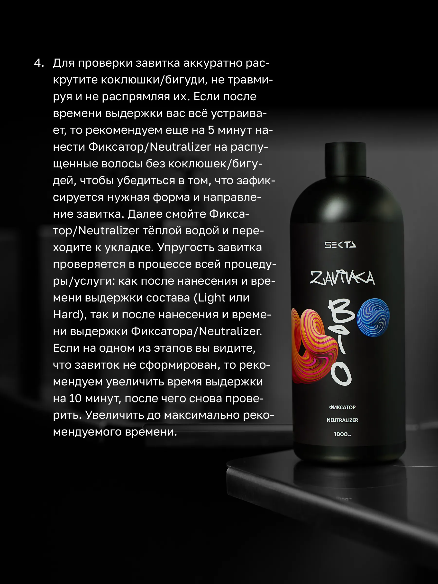 - Фиксатор / Neutralizer: продукт для завершения/закрепления завитка, сформированного с помощью BIO-Завивки Light или Hard.