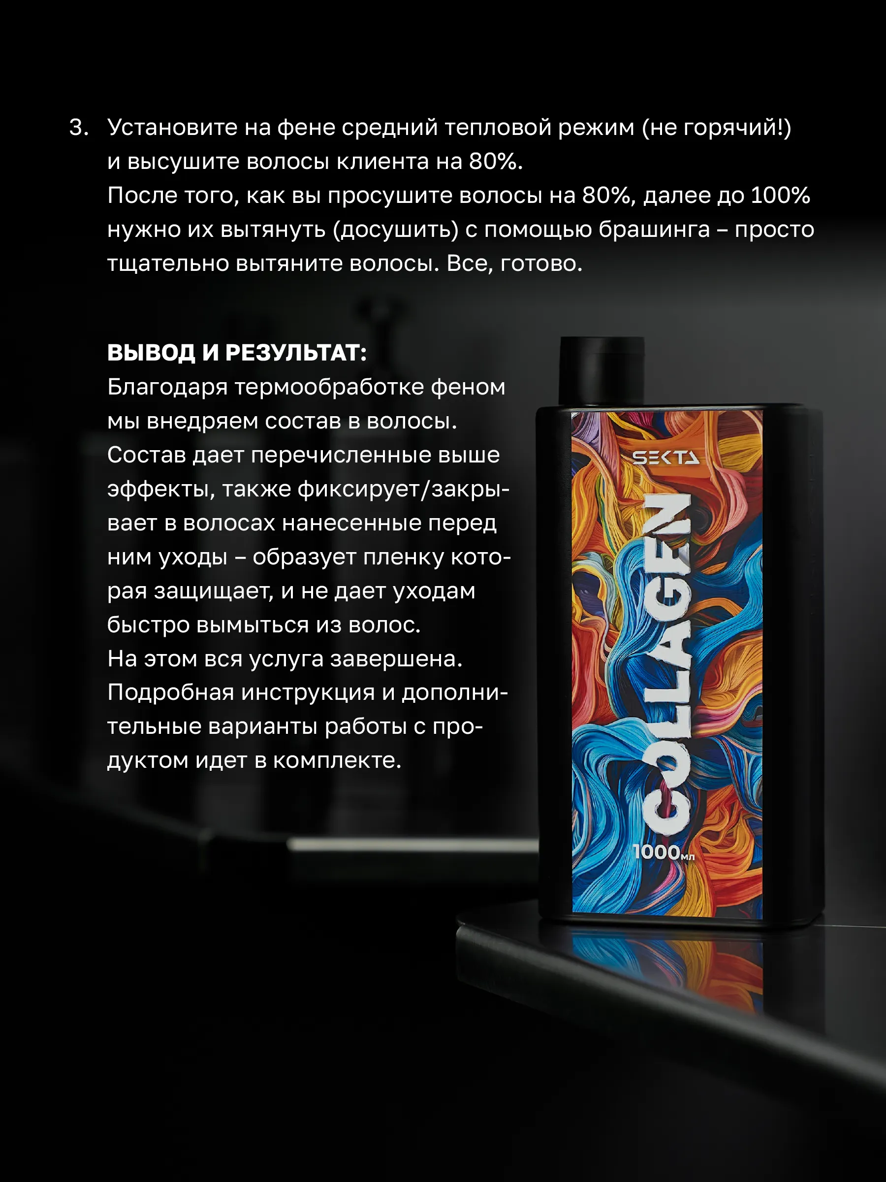 На этом вся услуга завершена. Если вы не перегрузили количеством коллагеном волосы, то они не будут казаться перегруженными. Если же волосы все-таки выглядят как перегруженные, то после термообработки просто помойте их любым шампунем и завершите мытье кондиционером/маской. Сам коллаген в таком случае не смоется, вы его уже внедрили в волосы при термообработке.